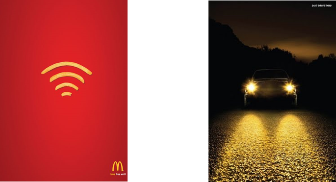 “McDonald’s-da pulsuz vayfay” və “24/7 McDrive xidməti” posterləri. Birinci posterdə fri-kartoflardan düzülmüş vayfay simvolu kreativin açarıdır. İkincisində isə avtomobilin işıqları yerə brendin tanınmış M hərfinin əksini salır.