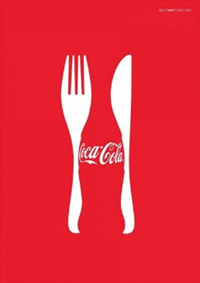 Aşağıdakı posterdə çəngəl və bıçaq elə təsvir edilib ki, onların bir araya gəlməsindən “Coca-Cola” butulkasının forması yaranır. Ötürülən ismarış isə çox ehtimal ki, budur: “Yemək vaxtı yalnız kola!”.
