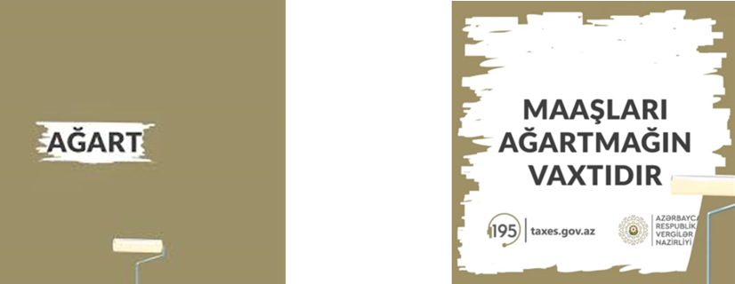 Azərbaycan Respublikasının Vergilər Nazirliyi üçün “Maxmedia” komandasının hazırladığı “Maaşları ağartmağın vaxtıdır!” çöl reklamına da tizer şəklində müqəddimə verilib. Sonradan aşkara çıxacaq əsas ismarışın yekrəng sahədə təkcə AĞART sözü göstərilib. Bir neçə həftədən sonra isə “Maaşları ağartmağın vaxtıdır!” çağırışı tam olaraq sərgilənib.